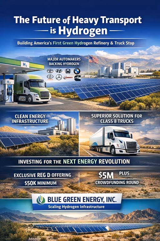 The hydrogen transition is already underway, and the infrastructure necessary to fuel America’s freight network has yet to be built. Blue Green Energy is positioned at the forefront of this shift, delivering the production capacity, fueling reliability, and strategic corridor placement required for nationwide hydrogen adoption. With shares offered at $2.50 and a forecasted $25.00 IPO, early investors have a rare opportunity to participate in a sector poised for exponential growth. Now is the time to secure an equity position in Blue Green Energy and take part in building the hydrogen backbone of America’s zero-emission future.